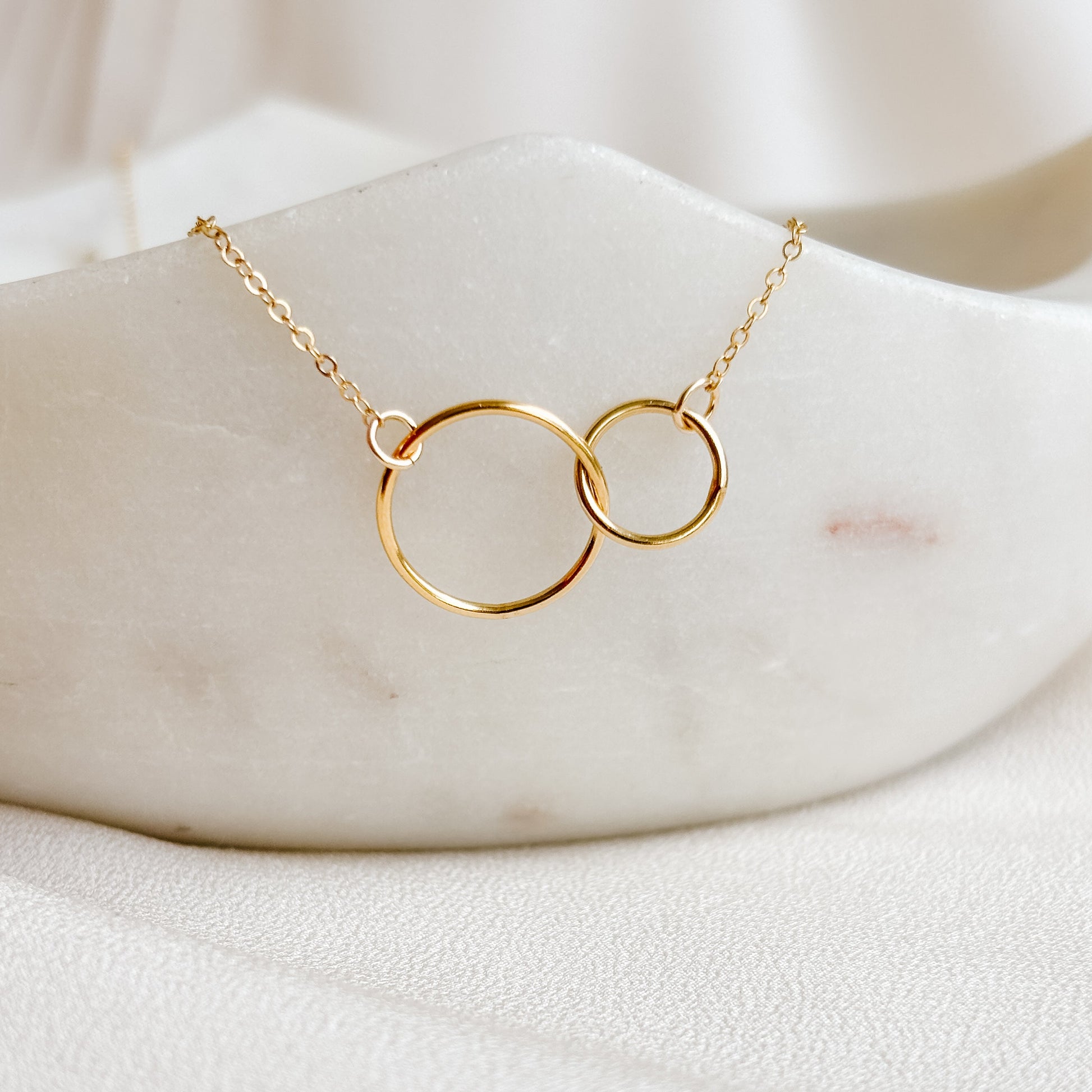 Some things are for the here and now, and some things are forever. Double open circles in an asymmetrical aesthetic are linked together and set in a dainty 14k gold filled chain to symbolize your lasting connection with a loved one. It's perfect for gifting someone you care about.